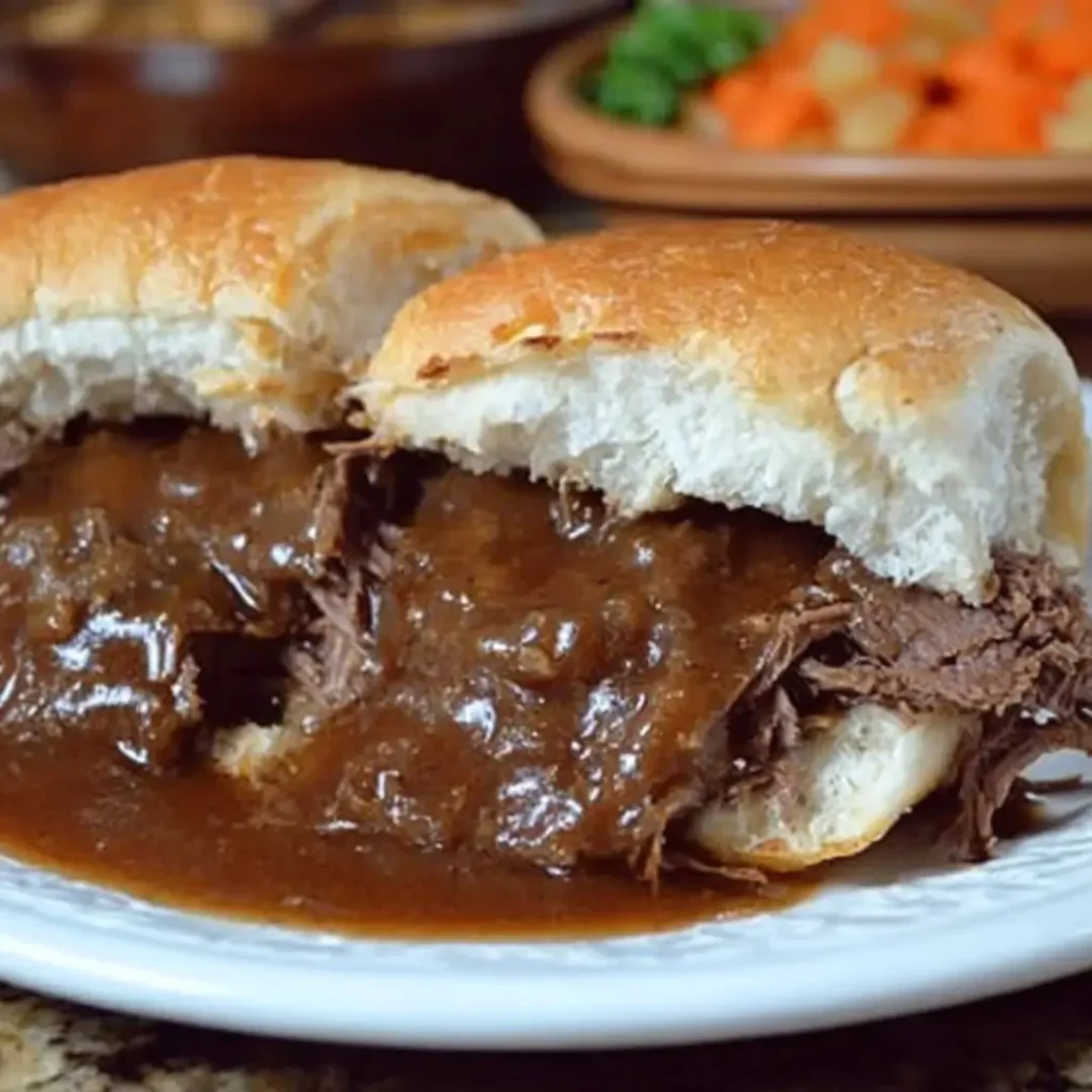 - For each serving, place two slices of toasted bread on a plate. Pile a generous amount of the hot, gravy-covered roast beef onto one slice of bread.