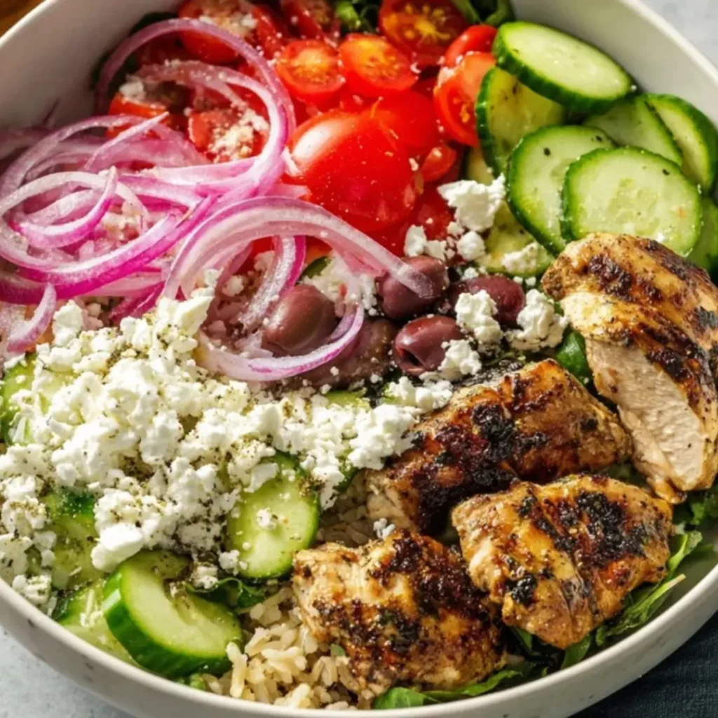 These vibrant Greek Chicken Bowls are packed with tender, oregano-marinated chicken, fluffy rice, crisp fresh vegetables, tangy feta, Kalamata olives, and a cooling homemade tzatziki sauce. A healthy and satisfying meal prep favorite!