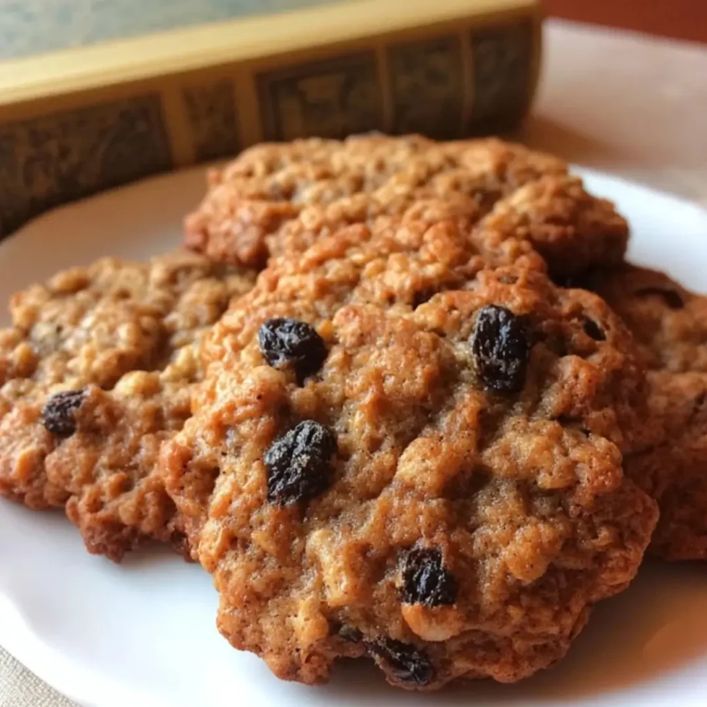A stack of classic oatmeal raisin cookies on a vintage plate, with a book and a cup of tea in the background.